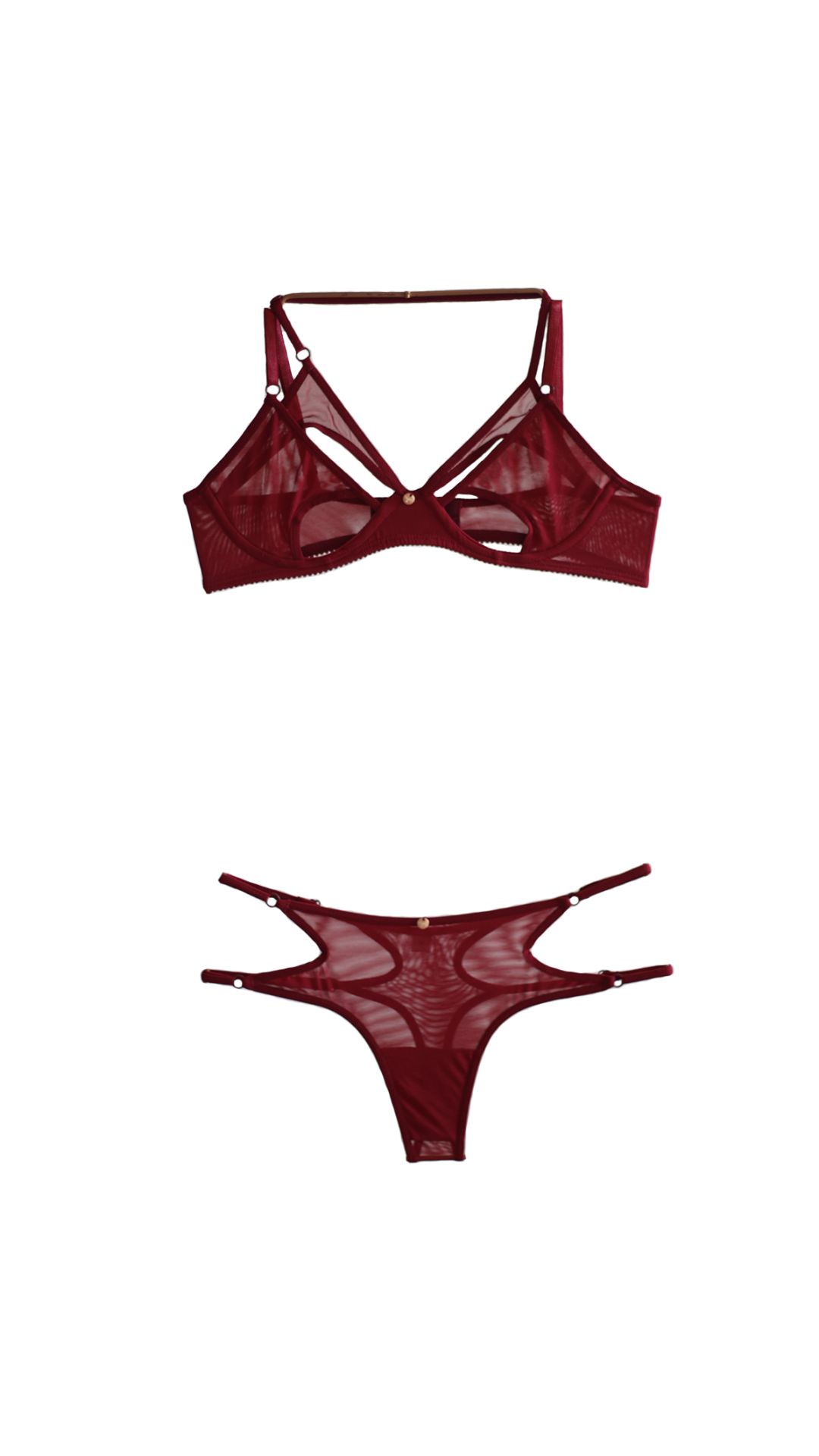 • Nuestro Set Fuego color Vino, está compuesto de dos piezas, su Bra tiene diseño doble y varilla, viene con tres cargaderas graduables, una en el cuello y una en cada lateral y tiene broche.